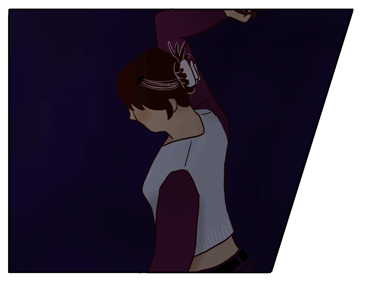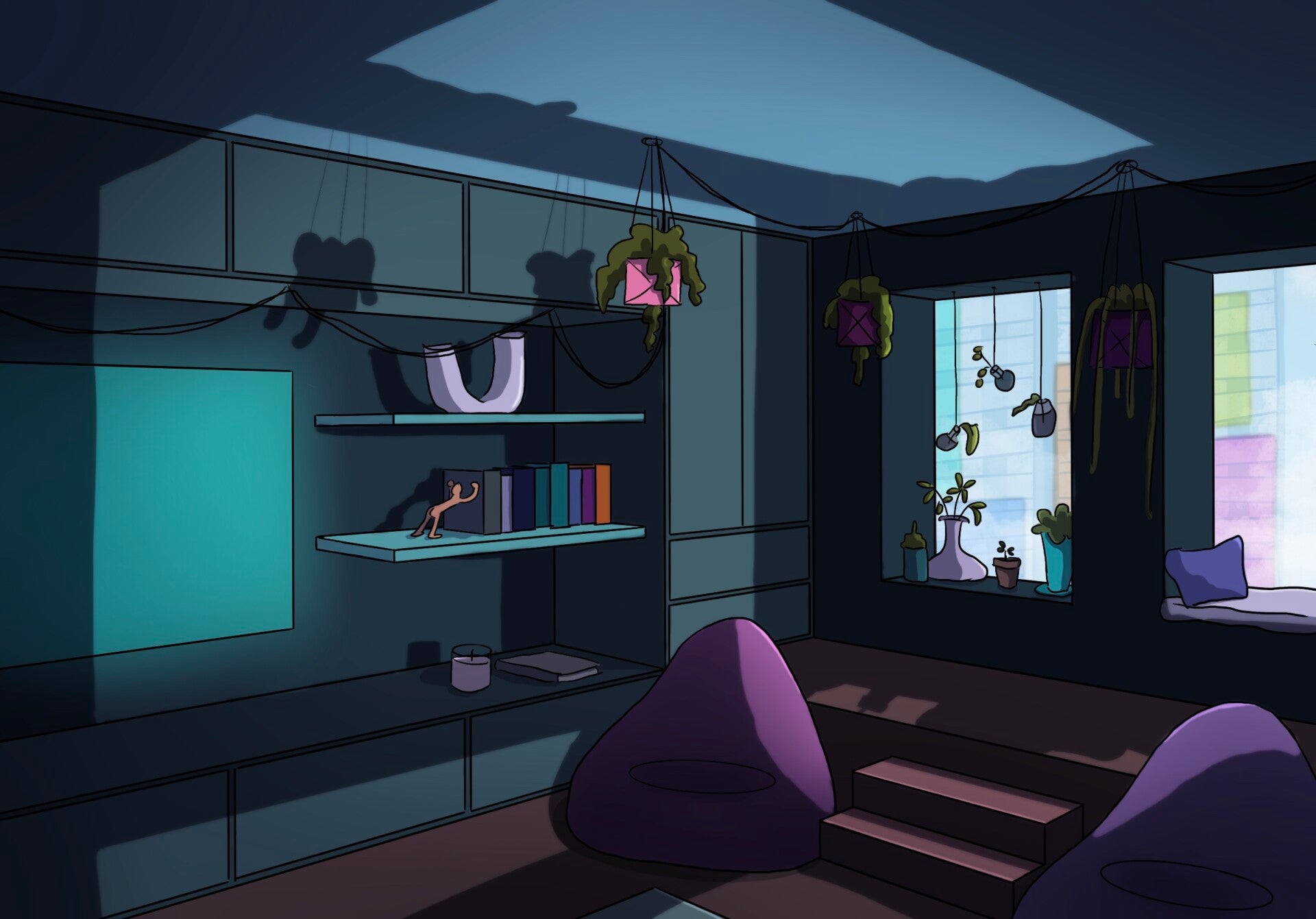Voor het uitwerken van de graphic novel had ik een aantal omgevingsschetsen gemaakt van het appartement van het personage. Dit hielp mij om een beter beeld te krijgen van hoe de (woon)kamer is opgebouwd.